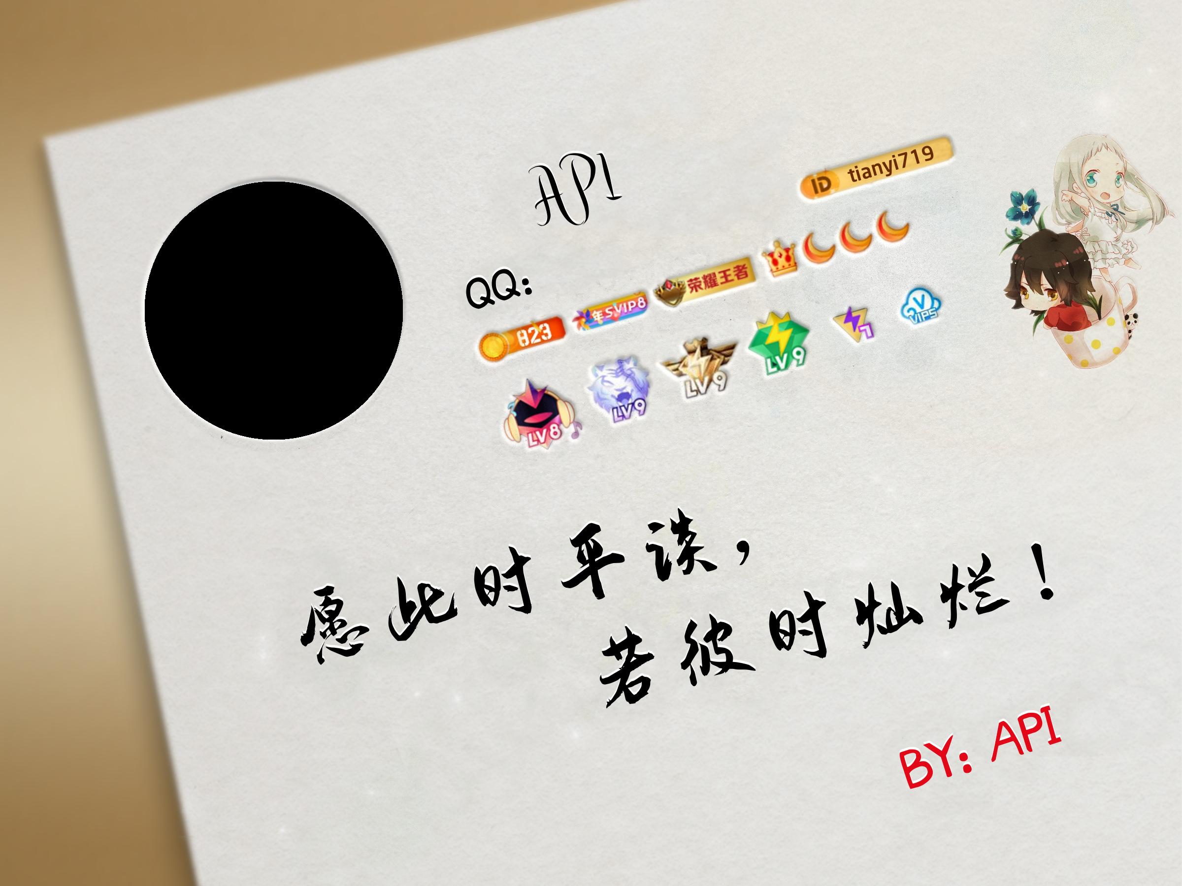 请求示例: https://api.suyanw.cn/api/qqcard.php?uin=836721503&qid=tianyi719&name=素颜-API&wa=愿此时平谈,&was=若彼时灿烂!